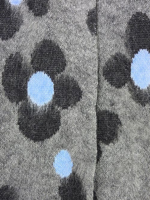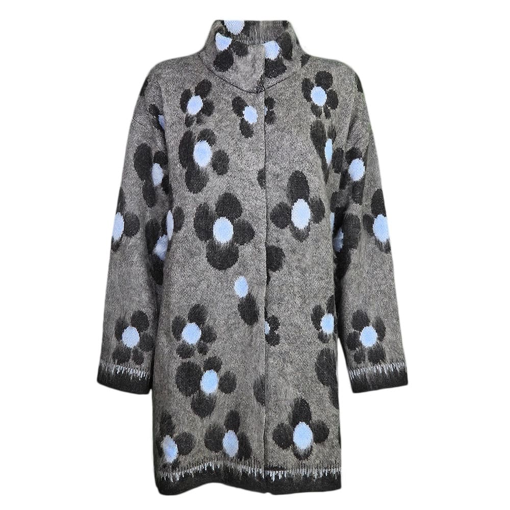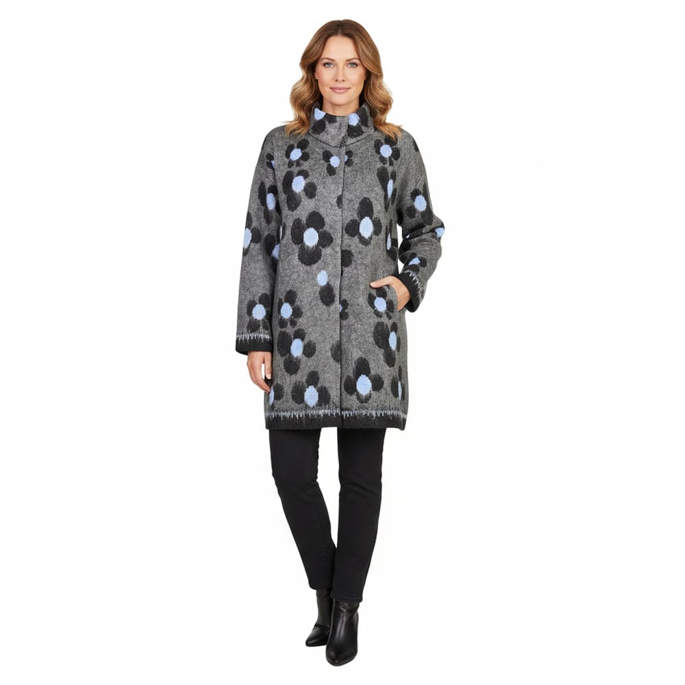 Cappotto in maglia chiusura bottoni automatici, con tasche, senza fodera, lavorazione con diverse tipologie di punti, lana di prima tosa, tinta in filo, disegno davanti e dietro.