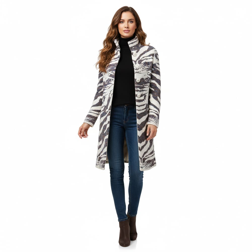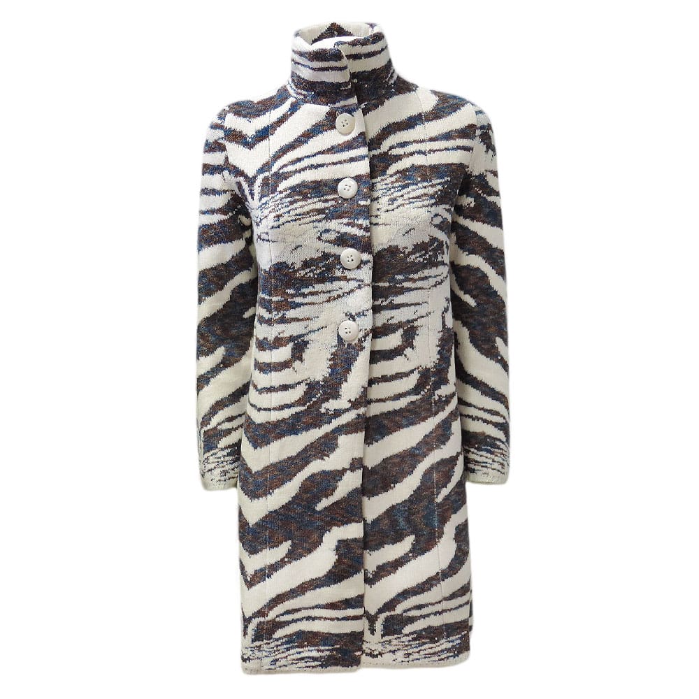 Cappotto con bottoni in maglia senza tasche e fodera, lavorazione con diverse tipologie di punti, lana di prima tosa, tinta in filo, molto morbido non pizzica.