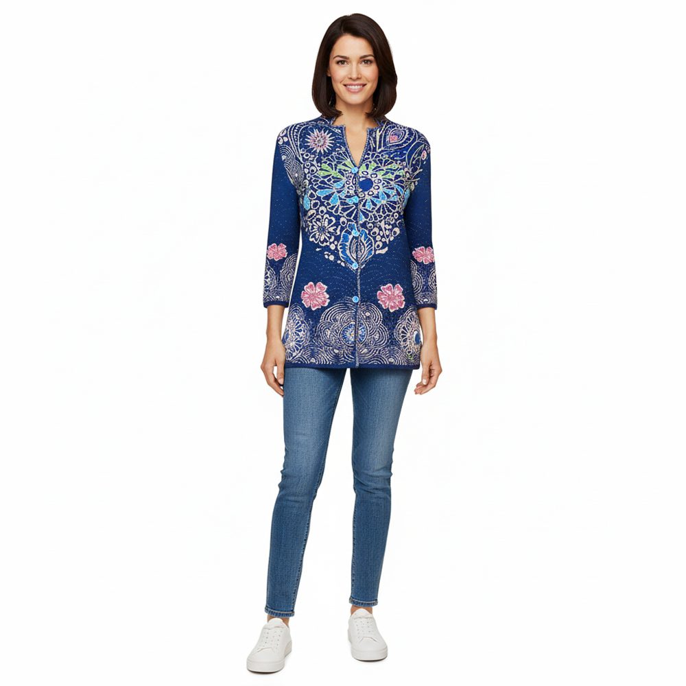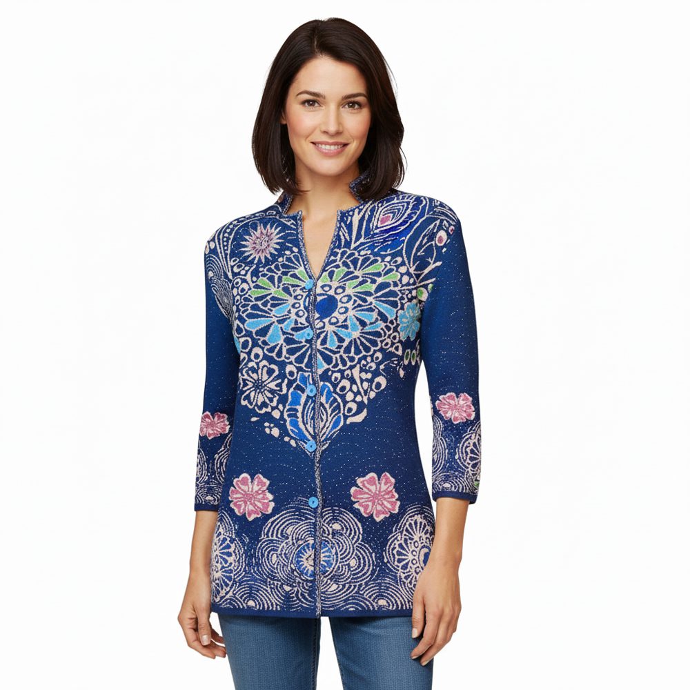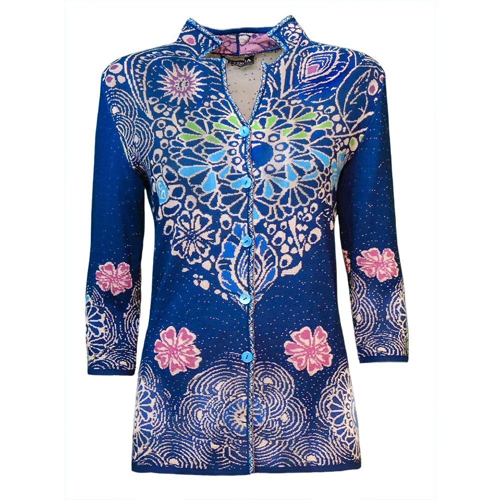 Cardigan in maglia, lavorazione con diverse tipologie di punti, disegno davanti e dietro, bottoni in madreperla il capo risulta caldo, adatto alla mezza stagione, il colore rimane invariato nel tempo anche dopo molti lavaggi