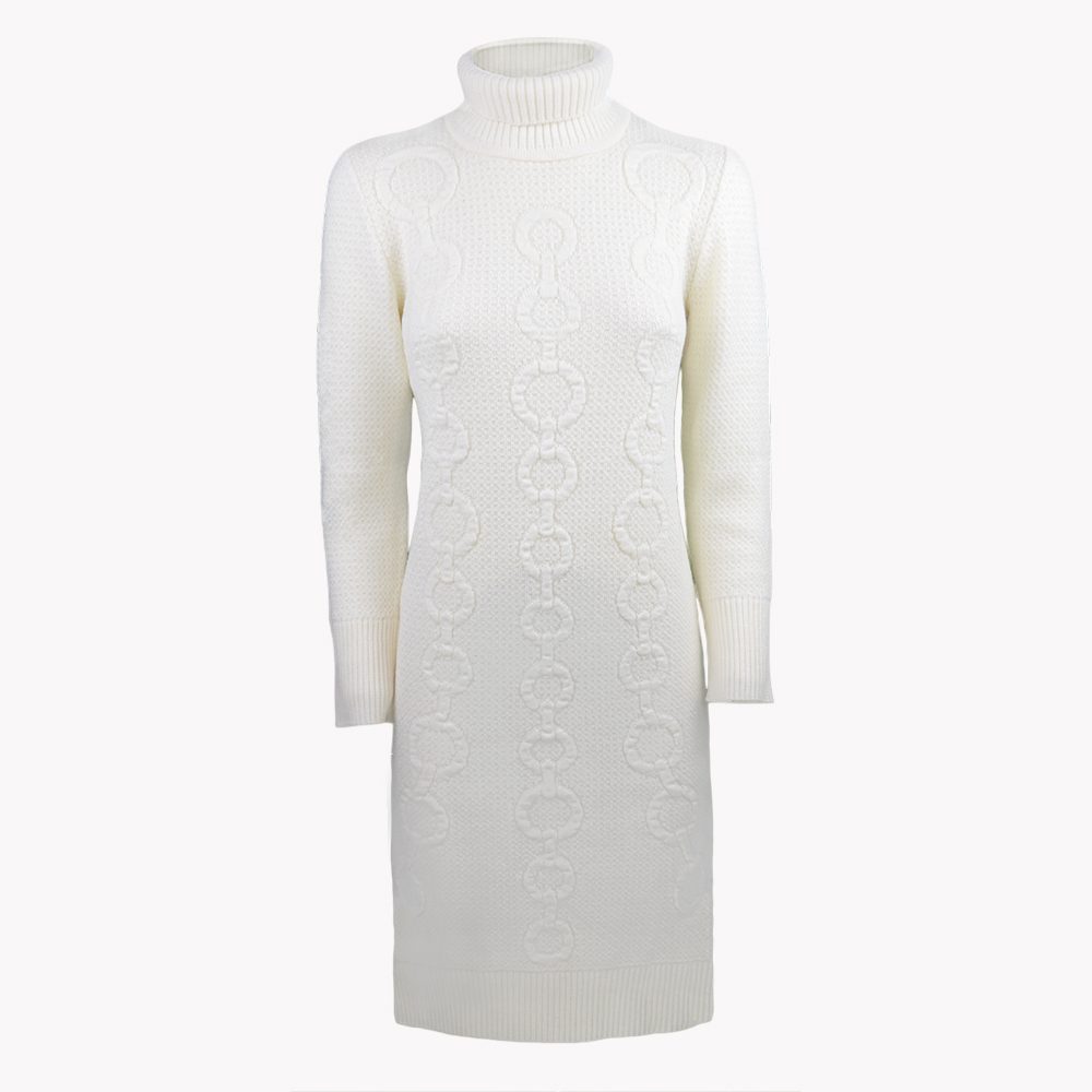 Vestito in maglia collo alto, lavorazione con diverse tipologie di punti, lana di prima tosa, tinta in filo, disegno davanti e dietro, molto morbido non pizzica.